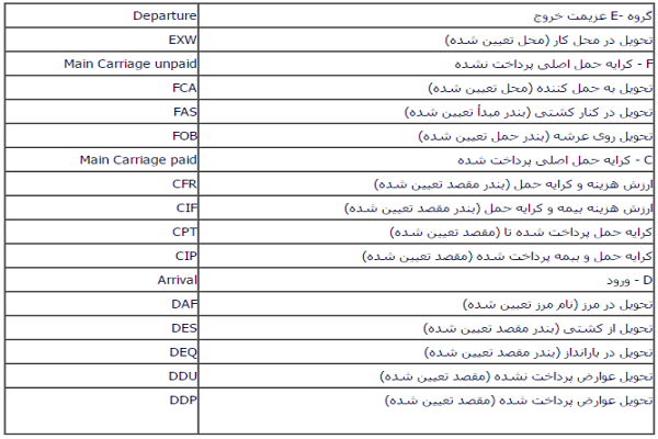 گروه E - نقطه عزیمت درمبدأ .که به موجب آن فروشنده تنها باید کالا را در محل کار خود در اختیار خریدار گذارده وکلیه هزینه های حمل ازدرب کارخانه تا بندروهمچنین کرایه بین المللی برعهده خریدارقراربگبرد.